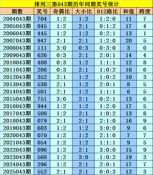开奖回顾:排列三第2026042期开出奖号795,奖号012路比为1:1:1,大小比为3:0,奇偶比为3:0,最近三年第043期同期开出奖号为:第2023043期:568、第2024043期:296、第2025043期:552。