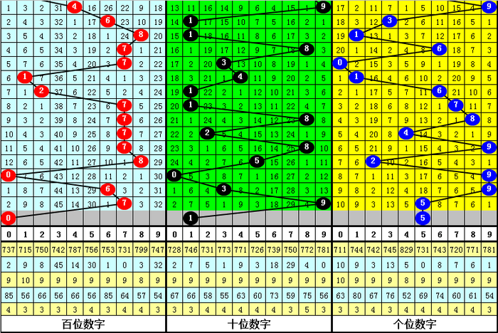 历史同期第043期十位号码开出为:0、4、4、4、1、2、0、8、5、3、0、5、4、0、7、0、7、5、9、6、9、5,振幅为9个点位,大小 号码比例为10:12,奇偶号码比例为10:12,012路号码比例为9:7:6,本期看好十位出现奇数号码,关注号码1。