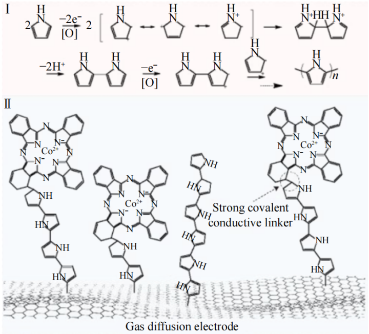 该方法以聚吡咯为连接桥梁,通过电聚合过程中引发的C—C偶联反应,将催化剂稳固锚定在电极界面,如图3所示。该策略不仅保障了催化位点的牢固负载与均匀分散,而且无需复杂的分子修饰或电极预处理,有效维持了电极的疏水特性,有利于CO2的高效传输。