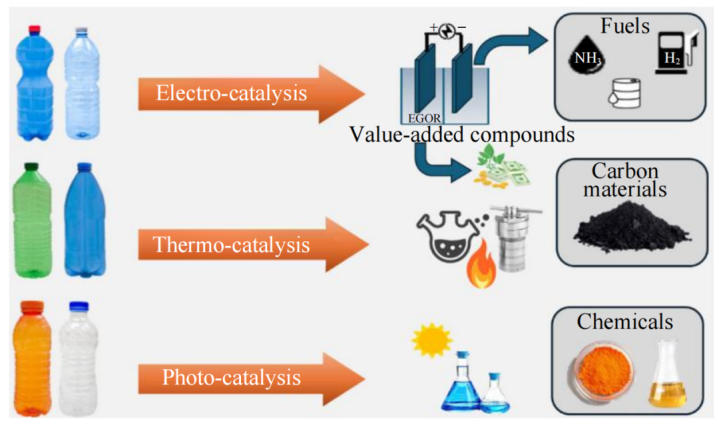 图9将PET塑料废弃物化学催化升级回收转化为材料、燃料及化学品示意