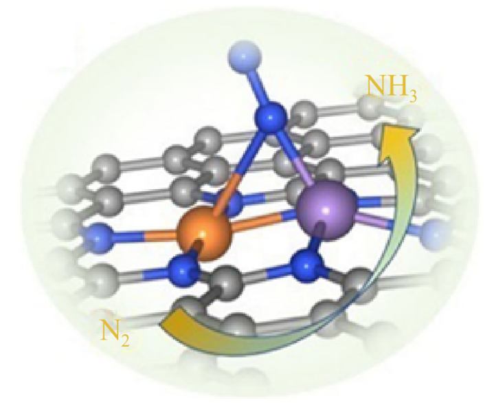 南京大学夏兴华团队报道了一种嵌入氮掺杂碳(NC)基质中的异核金属−金属键合双原子(DA)Mn−Cu催化位点的合成,如图4所示,局域在双原子位点上的不对称电子分布协同增强了N2的吸附与活化,促进了复杂的质子耦合电子转移过程。