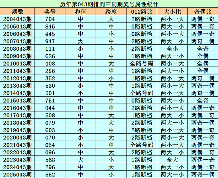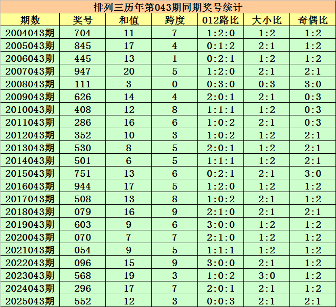 历史上第2026043期排列三已开出22期奖号了,历年同期奖号分别为:704、845、445、947、111、626、408、286、352、530、501、751、944、508、079、603、070、054、096、568、296、552,详细统计见下表: