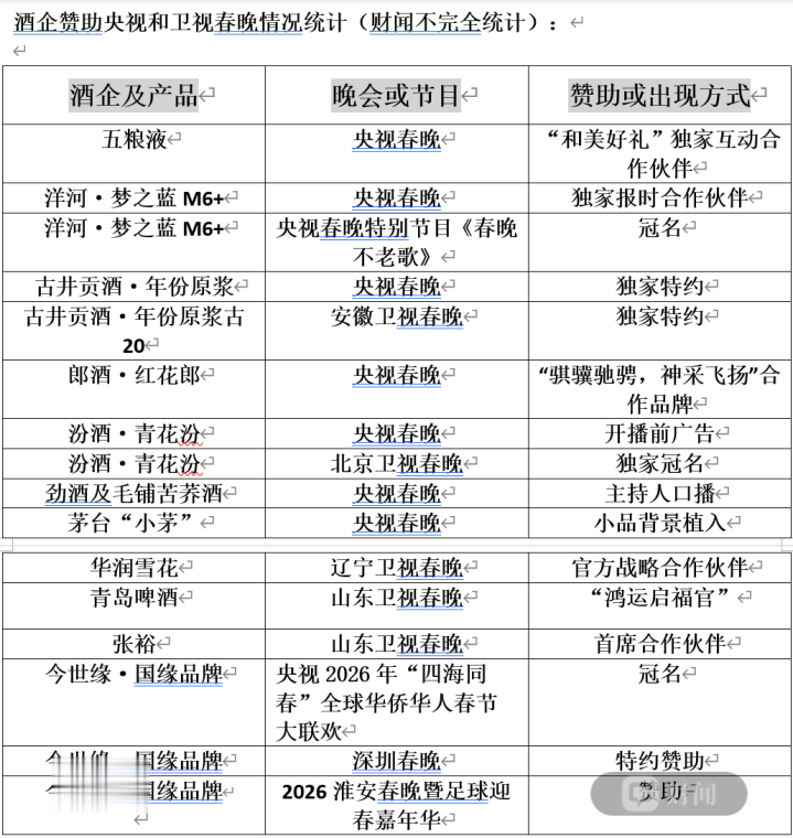 财闻注意到,这一赞助央视春晚的酒企阵容与2025年蛇年春晚相比数量还多了1家。除了央视春晚,包括央视春晚的一些衍生节目,以及众多地方台的春晚,各大酒企亦是重要赞助商。